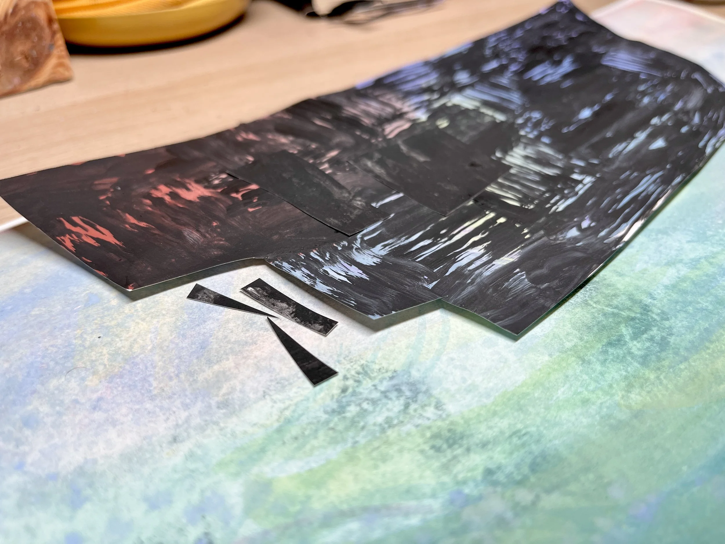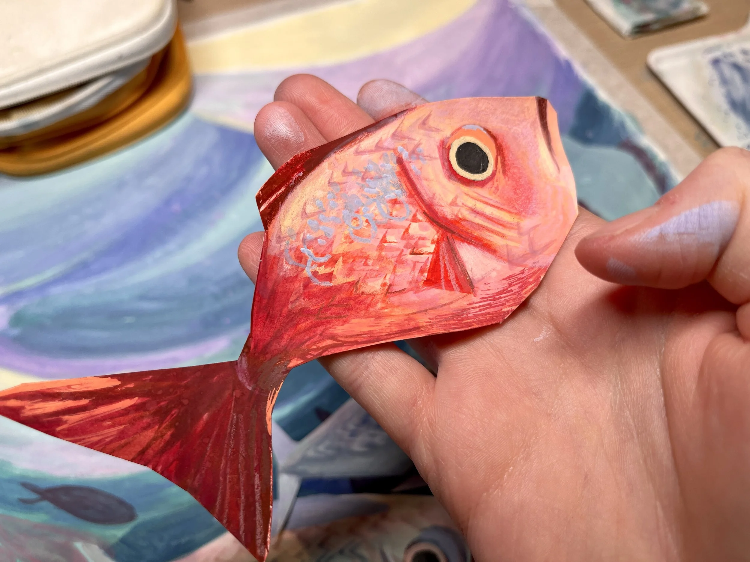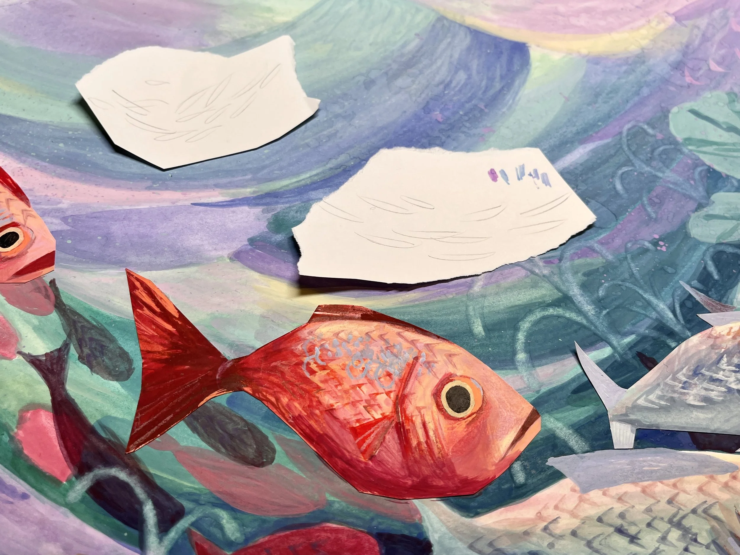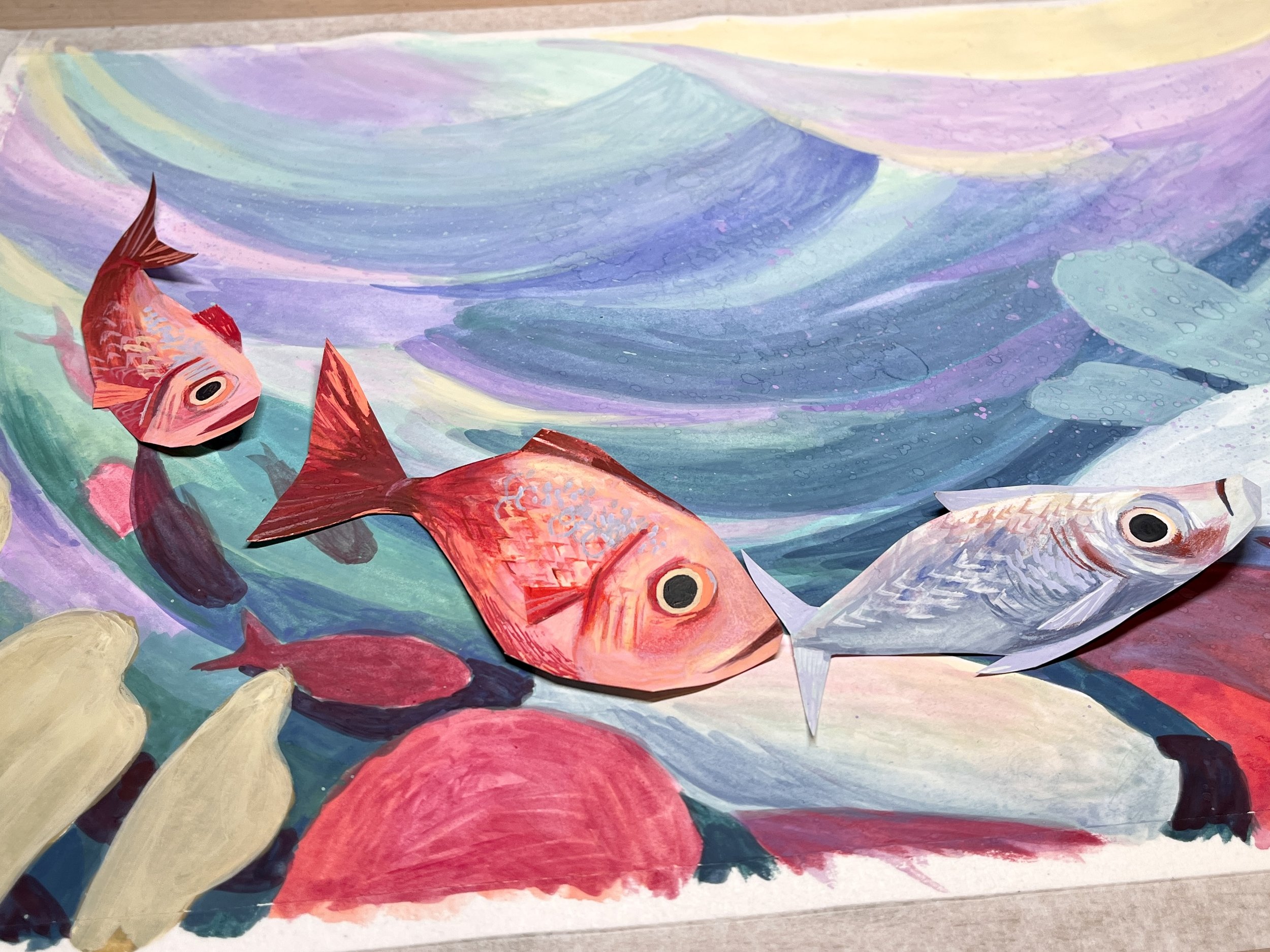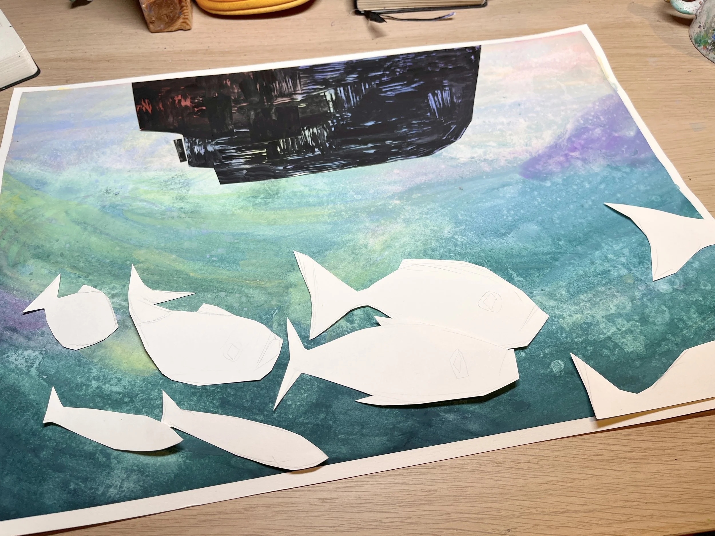 Even though I thought it looked a little odd, I was hopeful this would be a trust the process situation. I persevered and kept going for a few hours, prepping fish cut outs to paint. I guess the penny dropped when I asked Oscar, if he could tell what was happening in the piece, and he couldn’t tell that the boat was a boat. It just confirmed what I was already thinking. One very grumpy evening later, it was time to rethink.