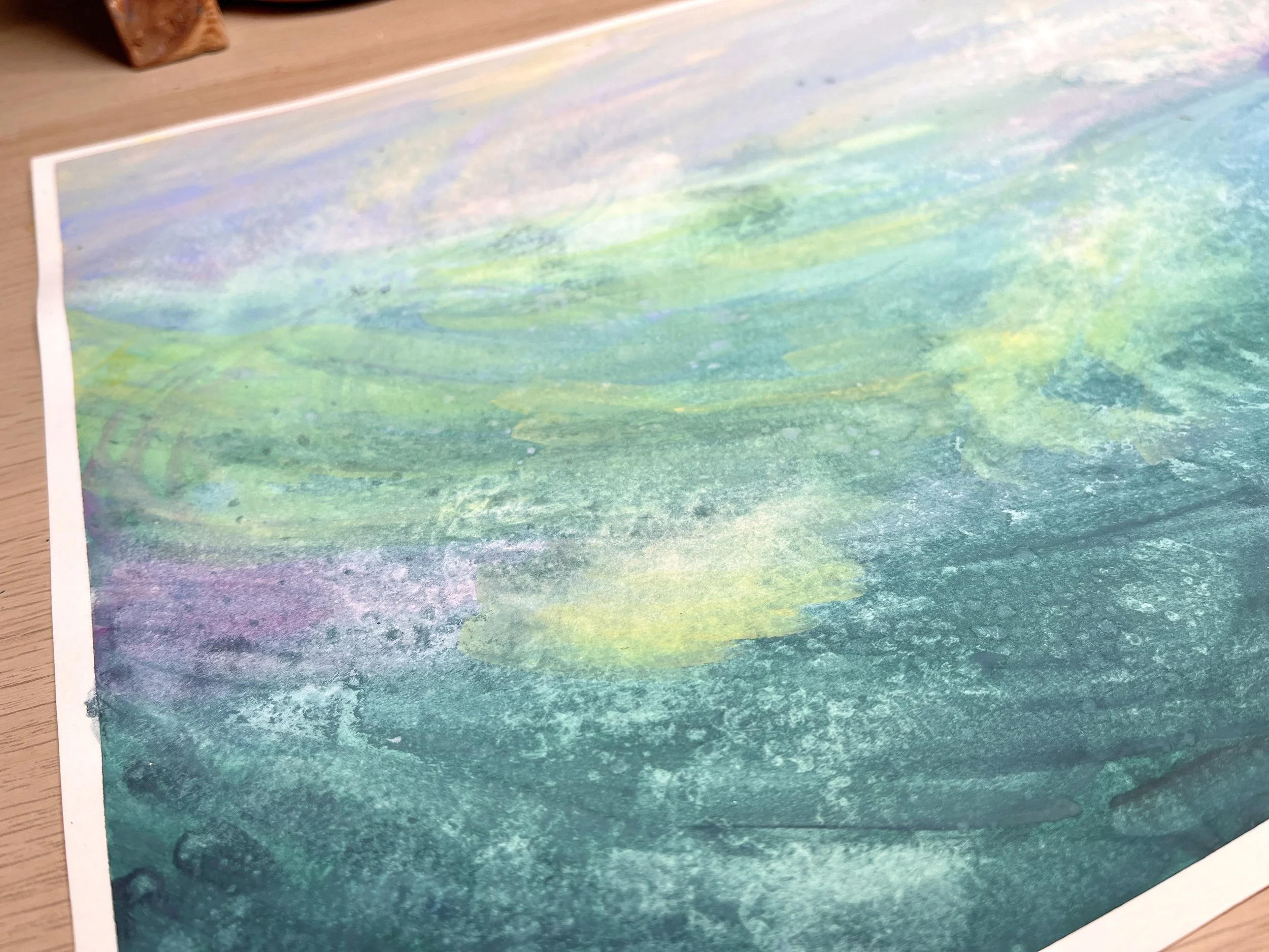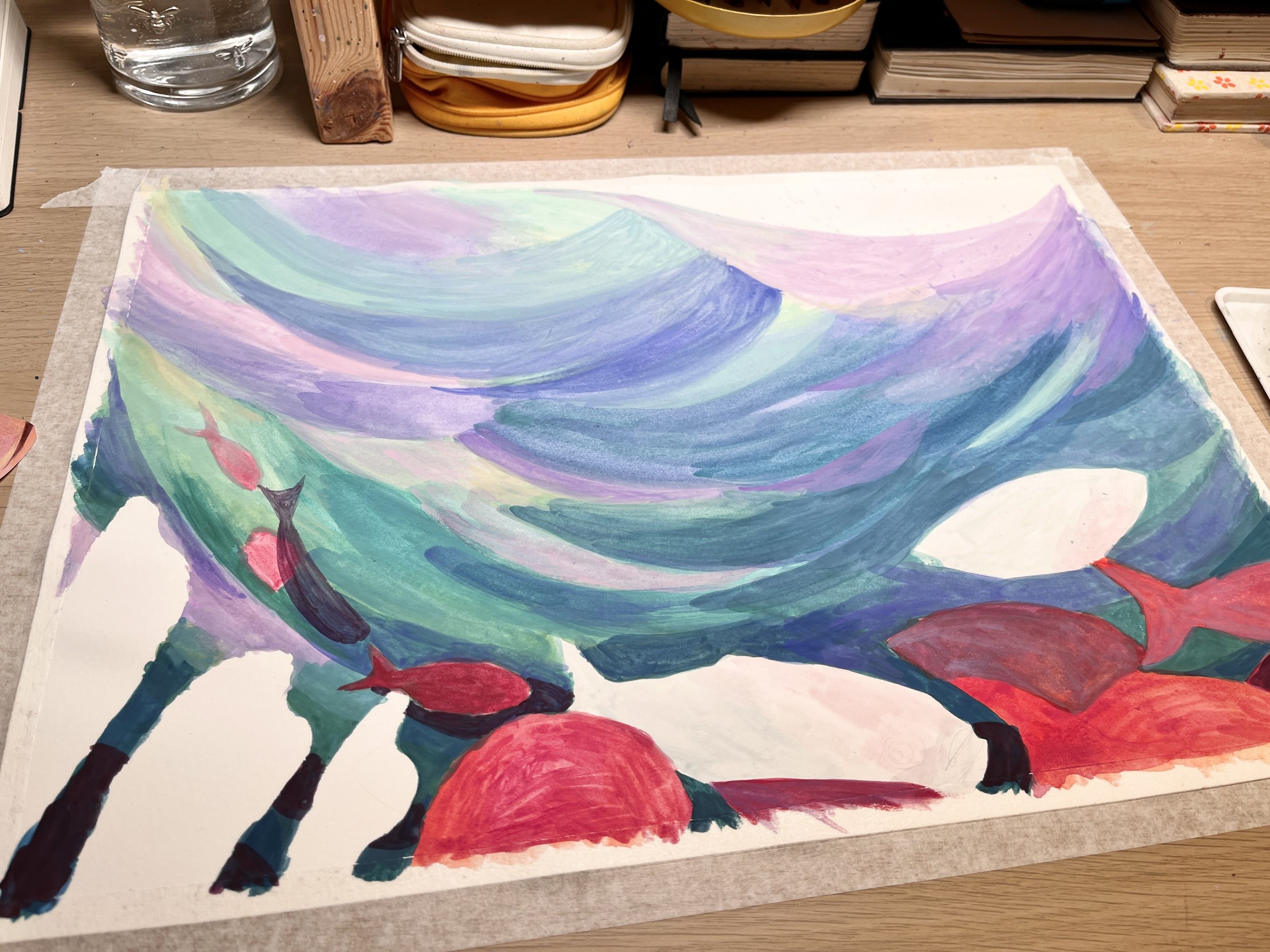 I wanted to make something which showed a cross section of the sea, with lots of movement and most importantly, a colour pallet outside of my comfort zone. After assessing my art from the past year, I noticed my colour choices were getting a bit repetitive - time for something new! I sketched out these thumbnails, minus the very small rushed one in the bottom left corner. That was drawn later after my almost ‘art meltdown’, and was the saving grace of this project.
