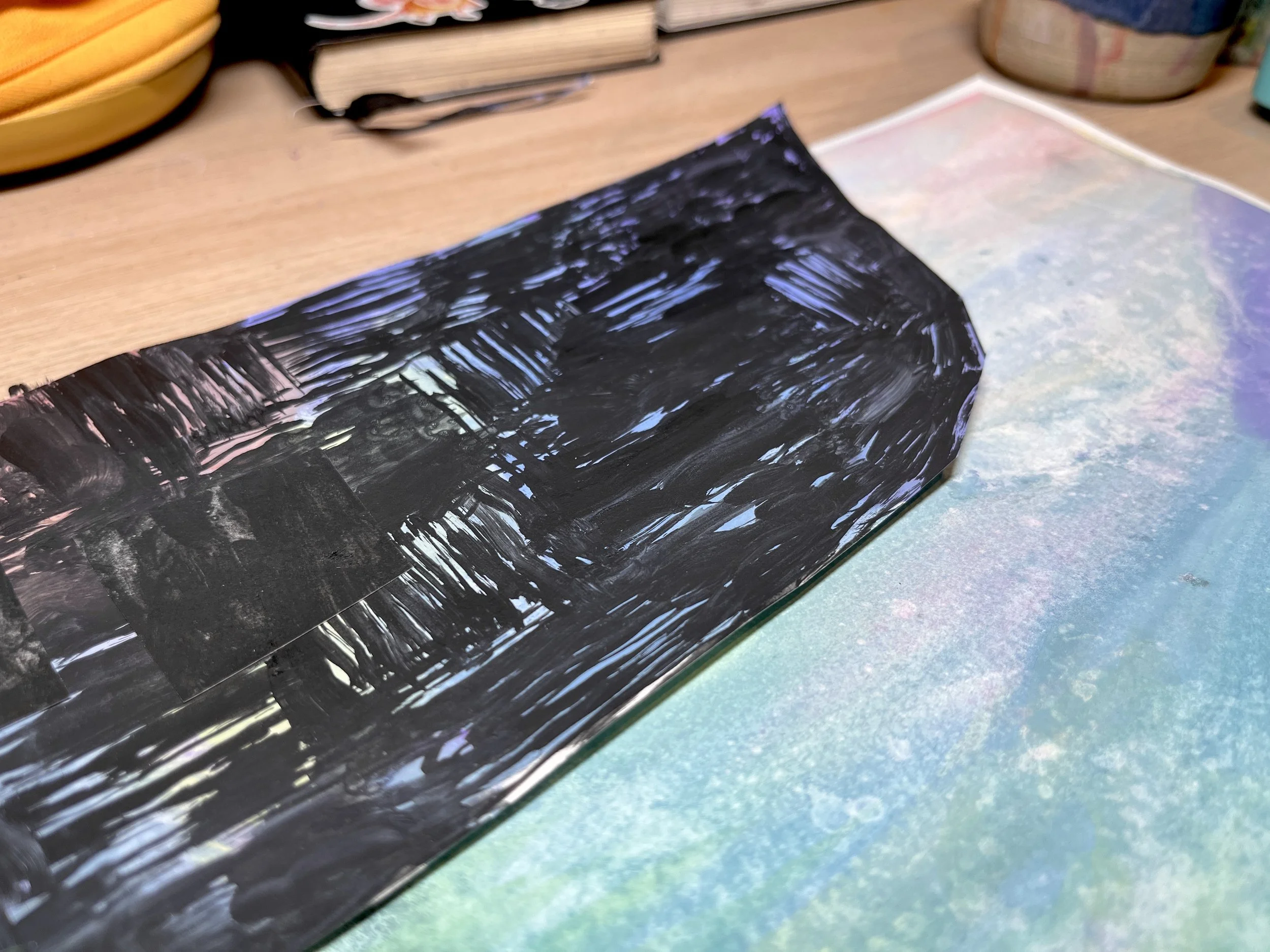I started by trying to paint a very blended colourful ocean, (on the left) but soon realised I hated it, so I painted over it, making lots of splatters and texture (on the right). This, I actually quite liked, which felt nice… but not for long. I had, what I now know, was a bad idea. I decided to add a big dark ugly boat to the top of the piece.